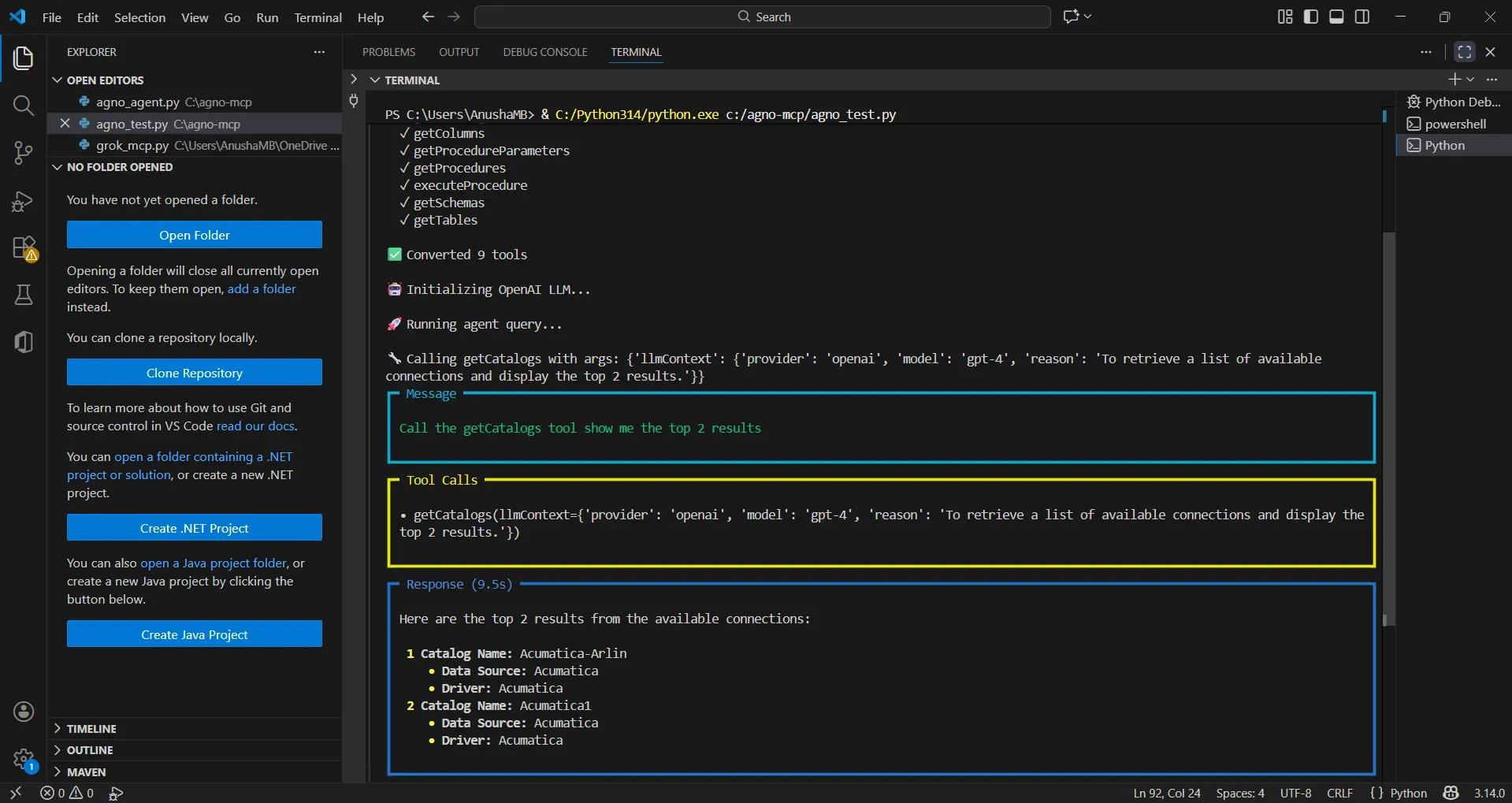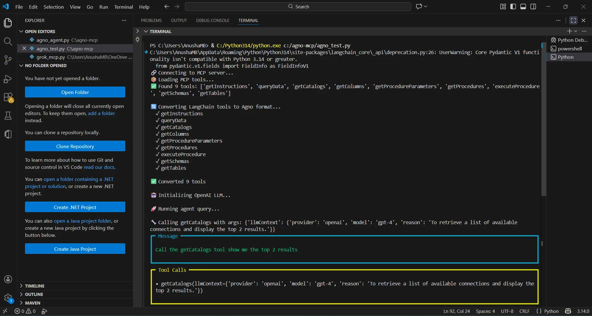 注意:Agno がすべての推論、計画、ツール選択を行います。LangChain は CData Connect AI が公開するツールを利用するための軽量な MCP 互換レイヤーとしてのみ使用されます。