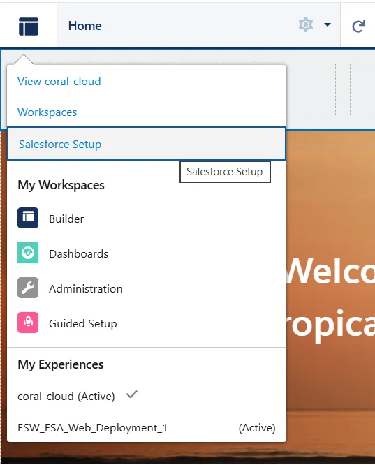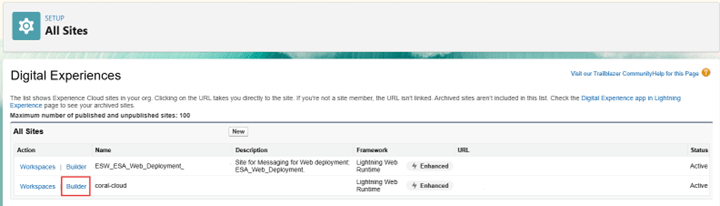 - 次に、Coral Cloud をホストする「Experience Cloud サイト」を公開します。 設定で「すべてのサイト」を検索し、「Builder(for coral-cloud)」を選択して「Publish」をクリックし、「Confirm」をクリックします。