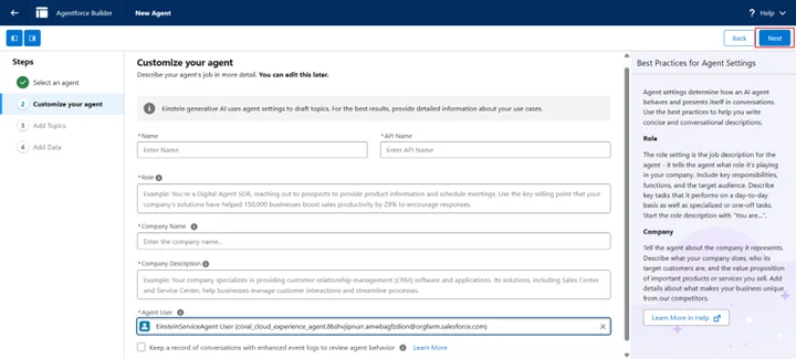 - 概要、名前、役割、会社情報を入力します。Agent User = EinsteinServiceAgent Userと設定しましょう。