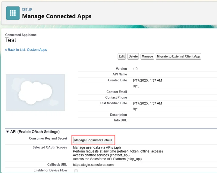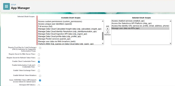 - 「Client Credentials Flow」でRun As: choose a user with at least API Only access を選択します。