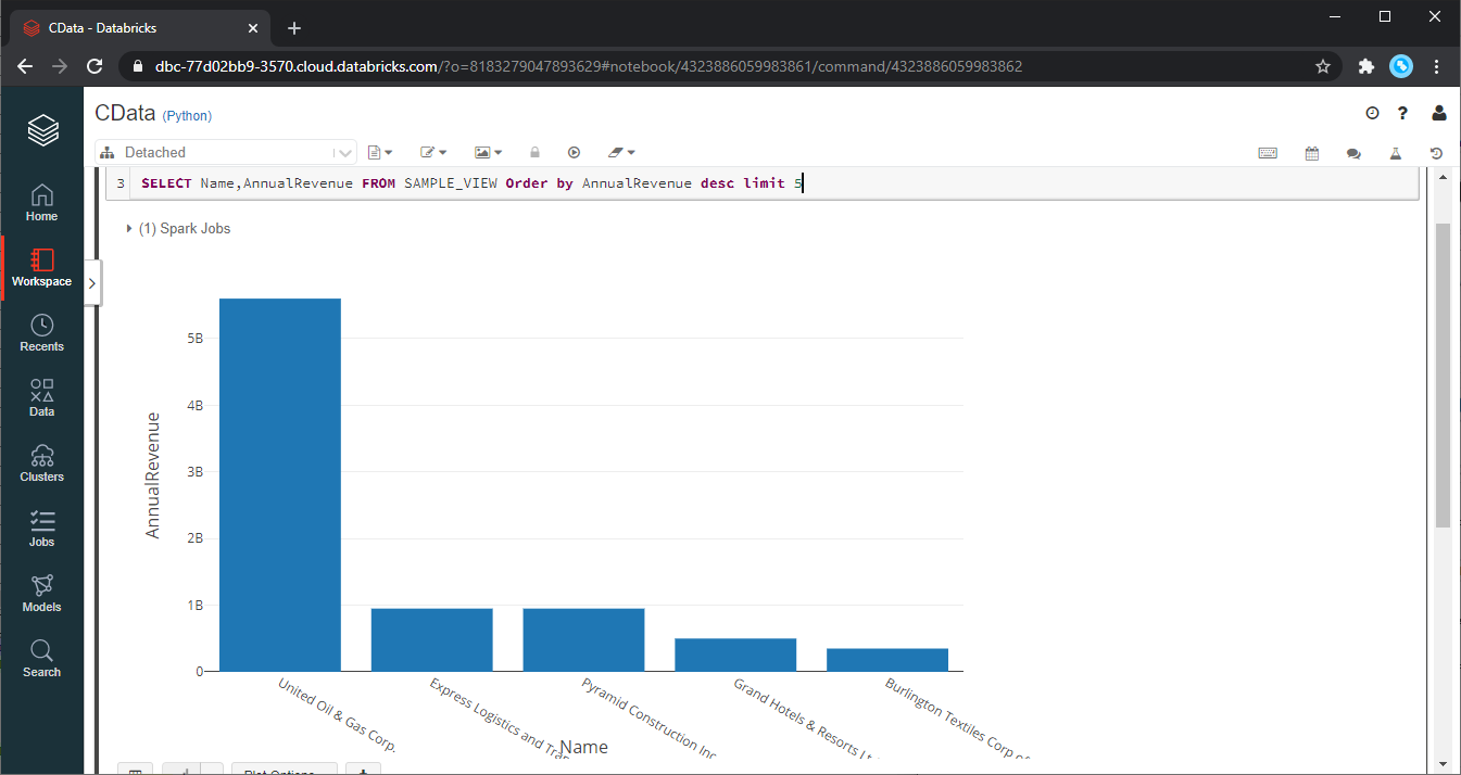 JAR ファイルをインストールしたら、Databricks でリアルタイムSQL Server のデータを操作する準備が整いました。ワークスペースに新しいノートブックを作成します。ノートブックに名前を付け、言語としてPython を選択し(Scala も利用可能)、JDBC ドライバーをインストールしたクラスターを選択します。ノートブックが起動したら、接続を設定し、SQL Server をクエリして、基本的なレポートを作成できます。