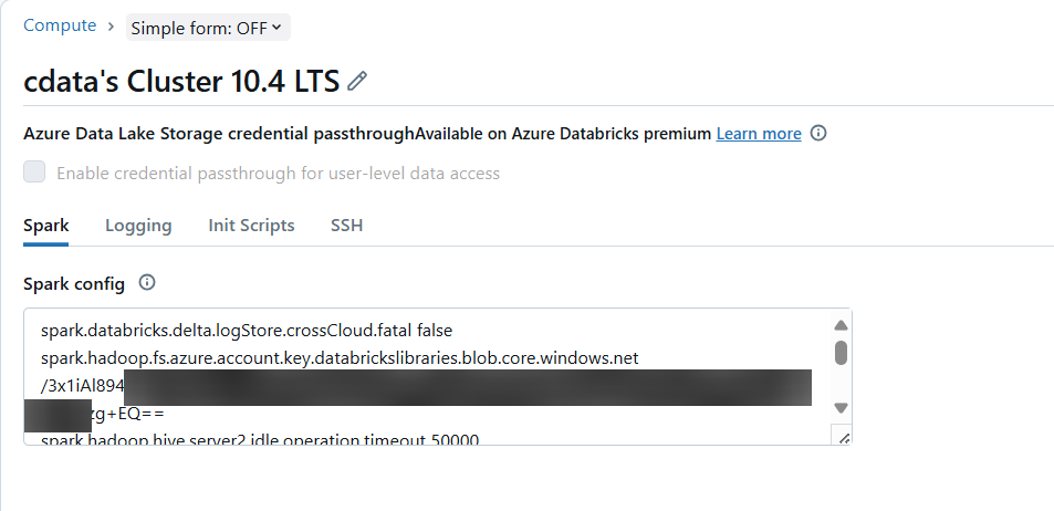 - Databricks クラスターの「Configuration」タブで「Edit」ボタンをクリックし、「Advanced options」を展開します。そこで、以下の Spark オプション(JAR URL のドメイン名から派生)に、コピーしたアカウントキーを値として追加し、「Confirm」をクリックします: