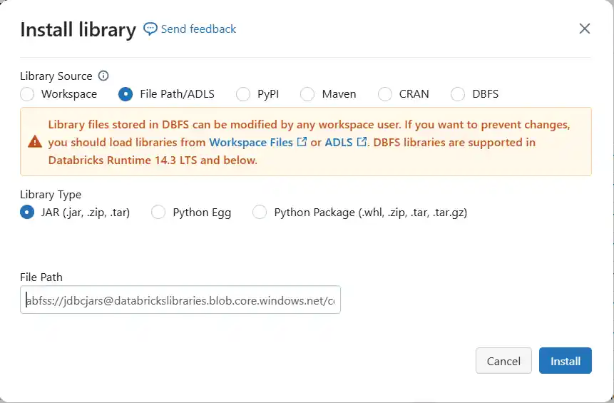 - Databricks クラスターの「Libraries」タブで「Install new」をクリックし、ADLS オプションを選択します。ドライバー JAR の ABFSS URL(これも JAR URL のドメイン名から派生)を指定し、「Install」をクリックします。ABFSS URL は以下のようになります: