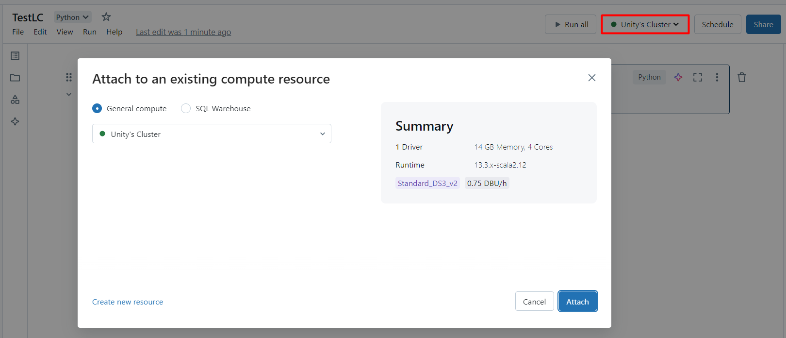 JAR ファイルがインストールされたら、Databricks でリアルタイムSQL Server のデータを操作する準備が整いました。まず、ワークスペースで新しいノートブックを作成します。ワークブックに名前を付け、言語として Python が選択されていることを確認し(デフォルトで選択されているはずです)、「Connect」をクリックして「General Compute」から JDBC ドライバーをインストールしたクラスターを選択します(デフォルトで選択されているはずです)。