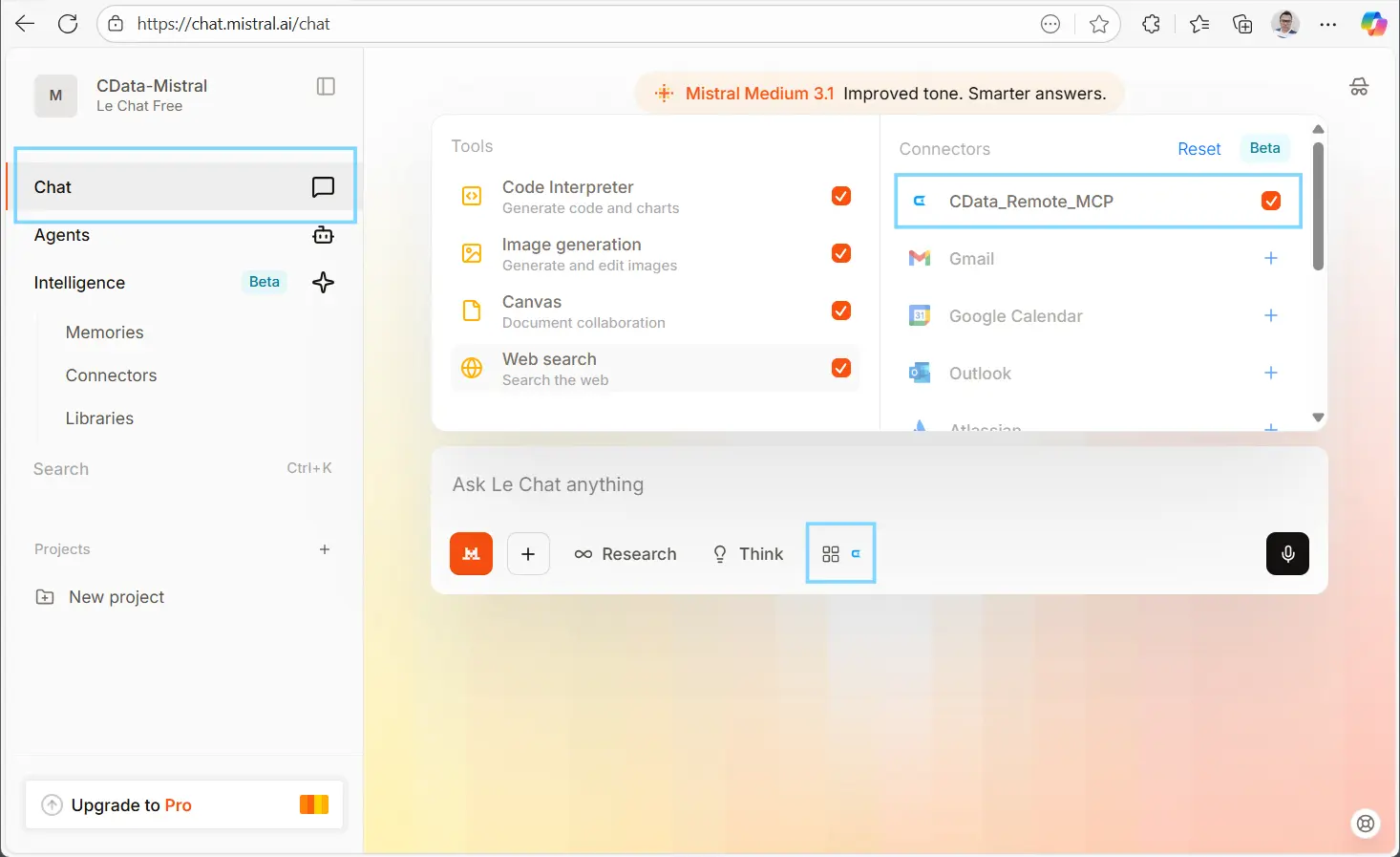 CData Connect AI で Stripe 接続とPAT を作成できたので、次は Mistral Le Chat 内でカスタム MCP コネクタを設定していきましょう。