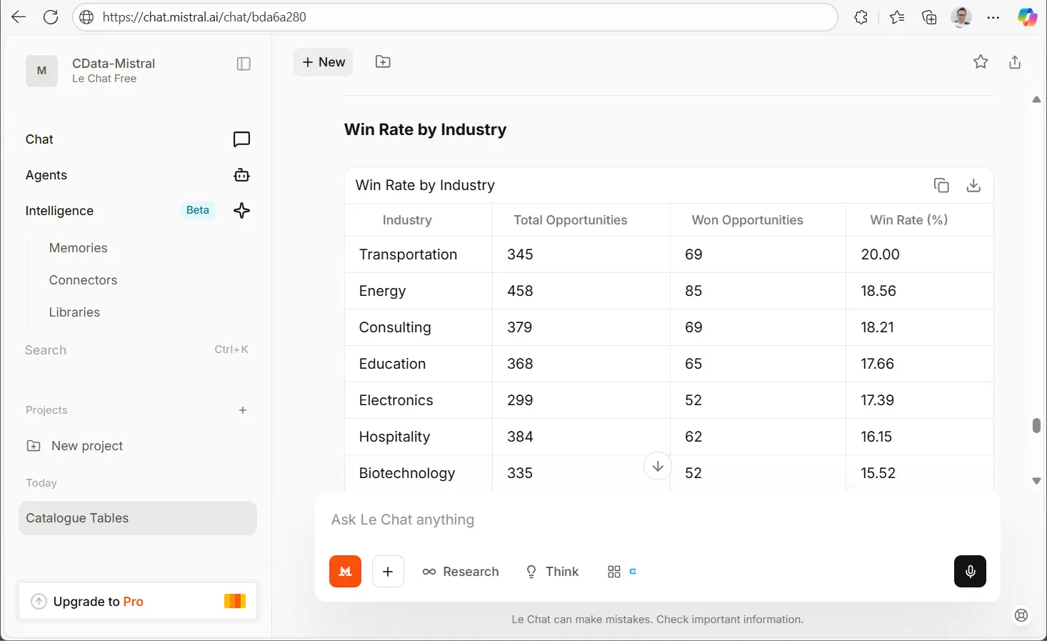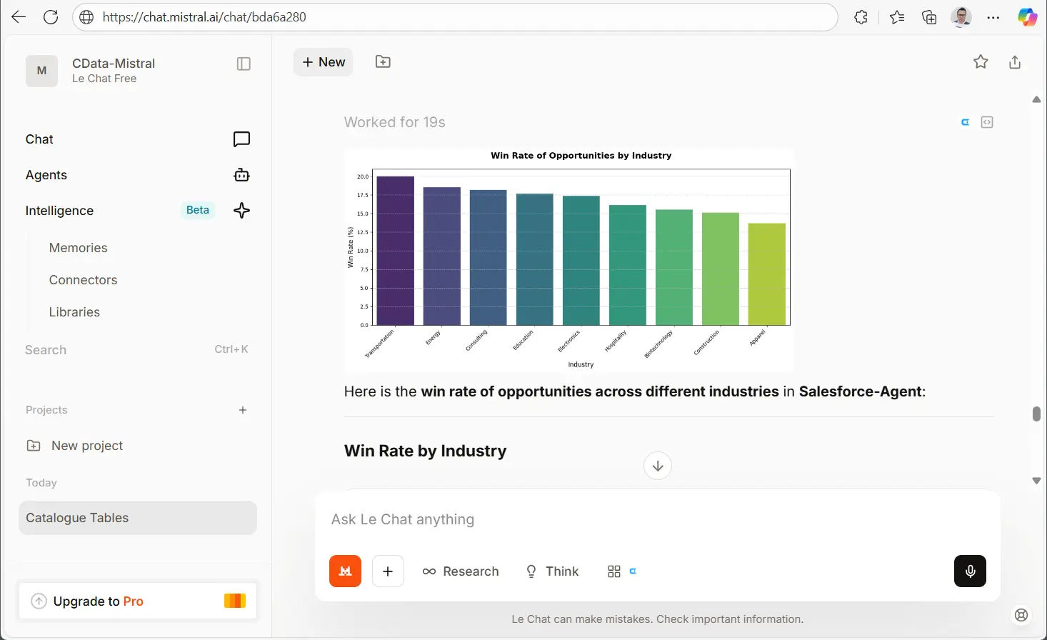 統合が完了したら、シンプルなクエリを超えて、複数ステップの AI エージェントを構築できます。これらのエージェントは、Mistral AI の推論機能と CData Connect AI を通じたエンタープライズデータへの安全なリアルタイムアクセスを組み合わせることで、売上予測、サポートトリアージ、顧客トレンド分析など、さまざまなワークフローを実現できます。