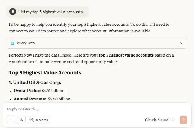 - Claude は自然言語のクエリを理解し、CData Connect AI のソースからデータを取得するために必要な手順を実行します。処理の流れも確認できるので、どのようにデータが取得されているかが分かりやすくなっています。