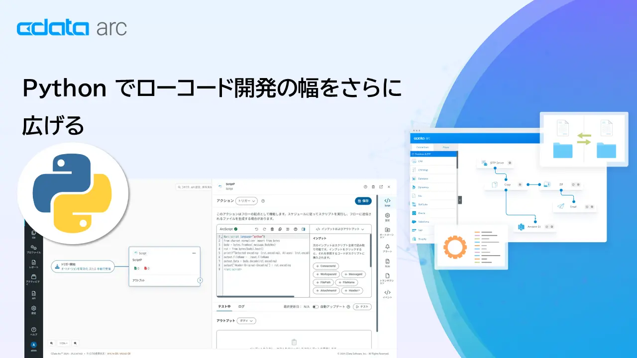 Arc では独自のスクリプト言語としてArcScript を提供し、カスタム処理が必要な複雑なビジネスロジックをローコードで実装いただけます。今回のアップデートでは、ArcScript 内でPython スクリプトをサポート。情報システム部門やSI 事業者の方に馴染みのあるPythonで、複雑なデータ変換処理を効率的に実装できます。